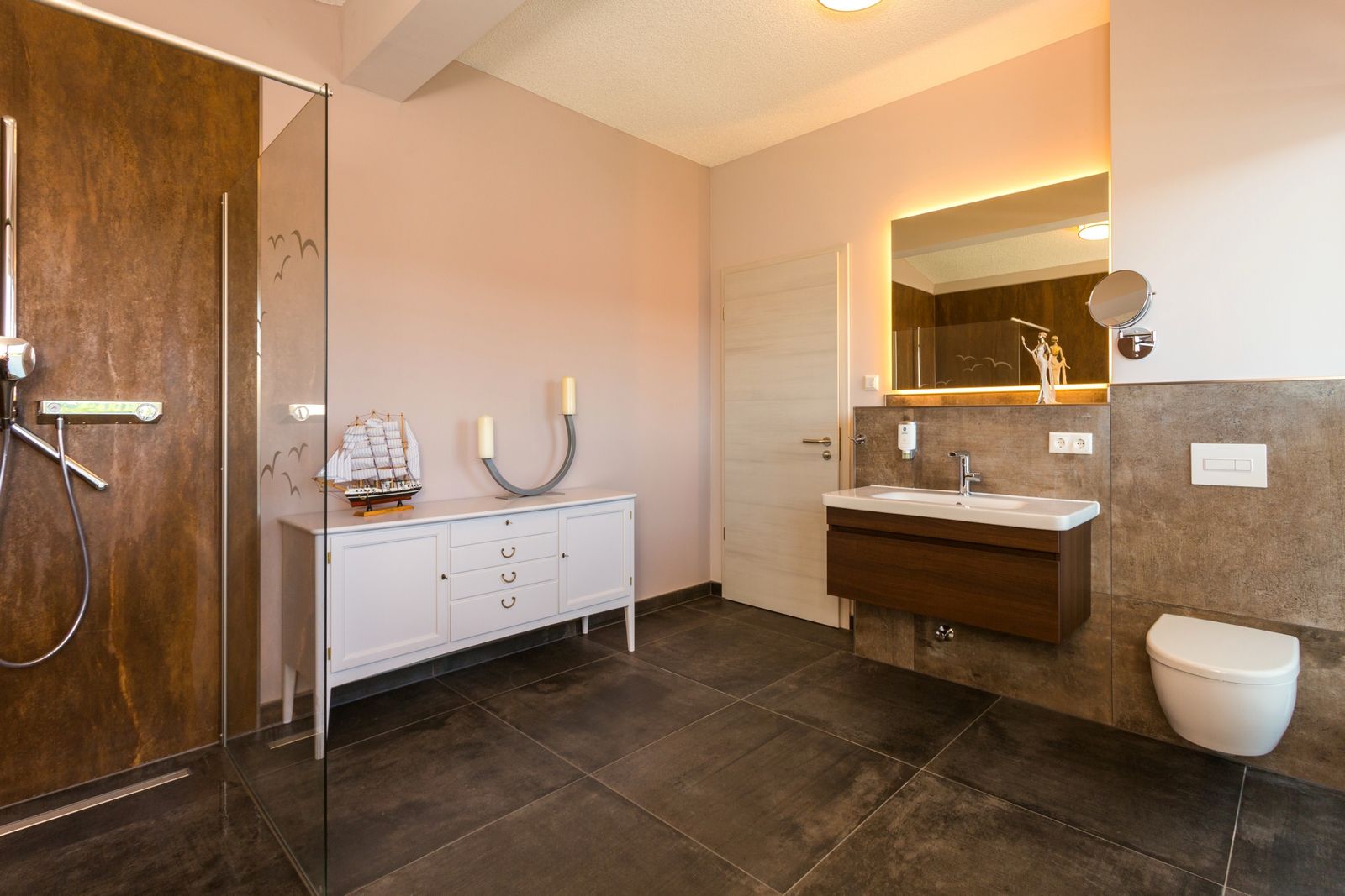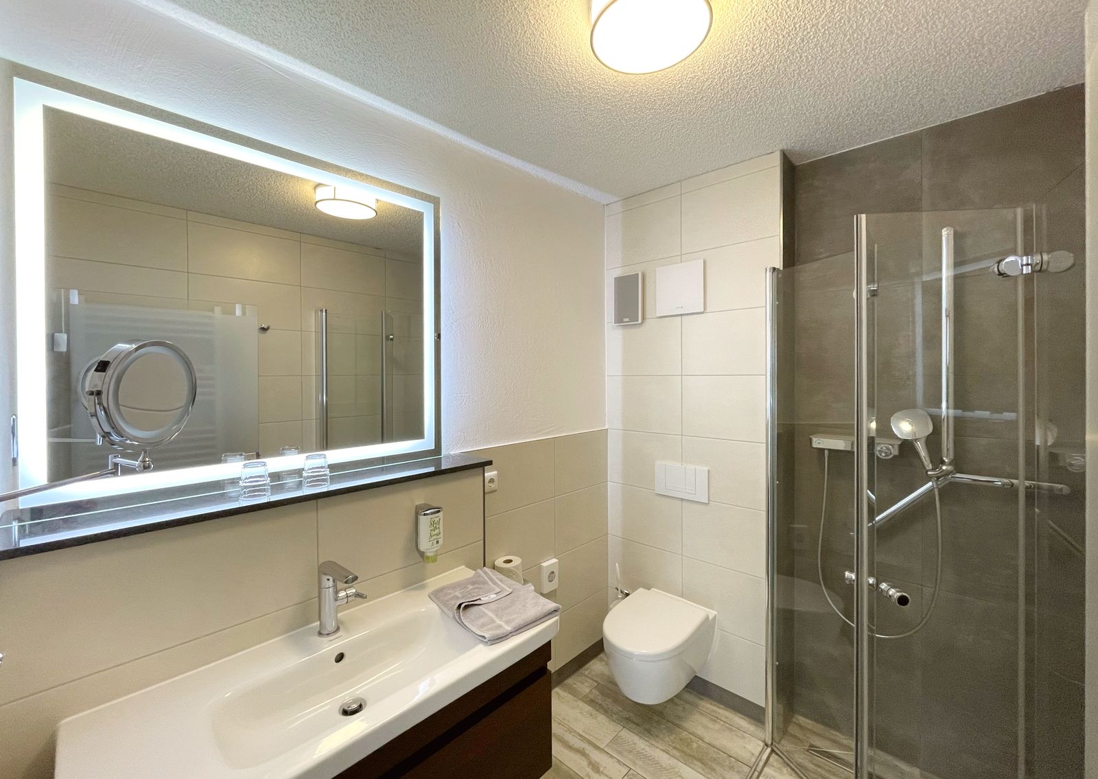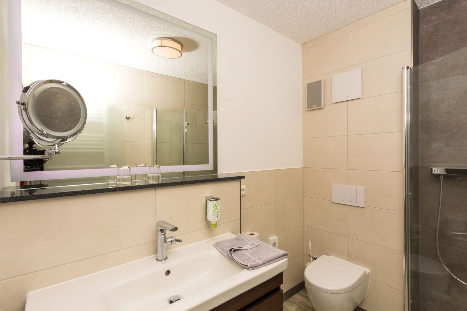 - Badezimmer mit Fön und Lautsprecher für Fernsehen oder Radio